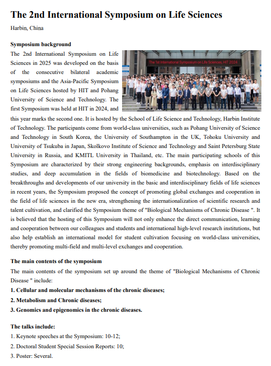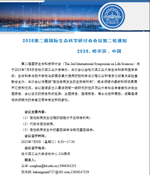 第二届国际生命科学研讨会(The 2ndInternational Symposium on Life Sciences)将于2025年7月8日在哈尔滨...