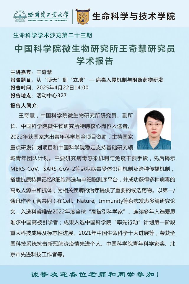 【生命科学学术沙龙第二十三期】中国科学院微生物研究所王奇慧研究员、刘宏伟研究员、张寿悦研究员学术报告通知