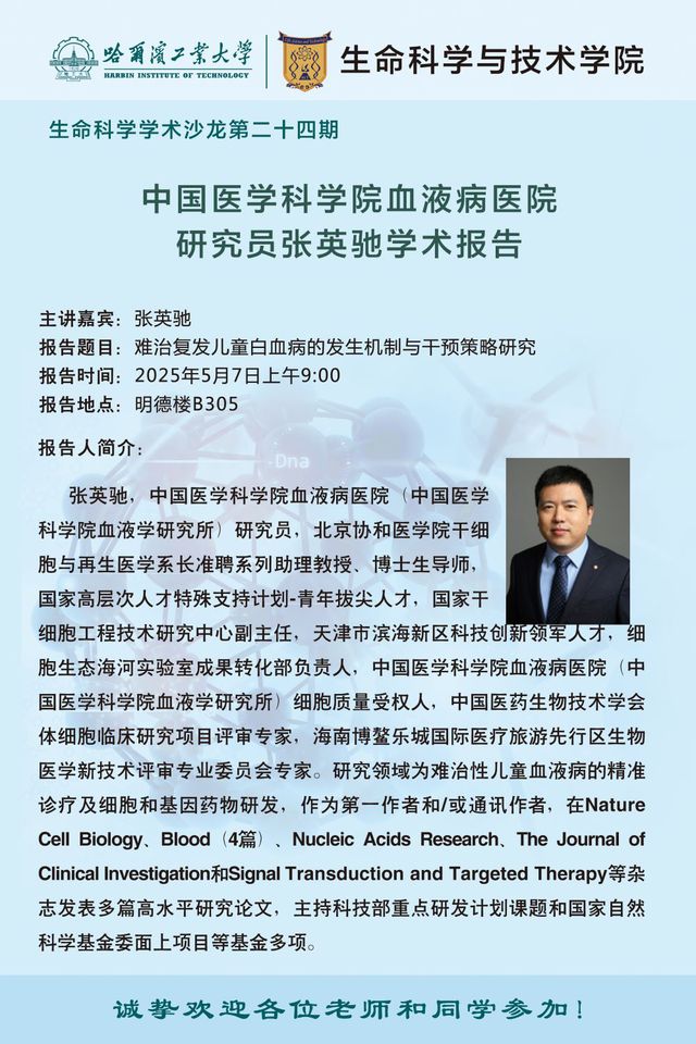 【生命科学学术沙龙第二十四期】中国医学科学院血液病医院研究员张英驰学术报告