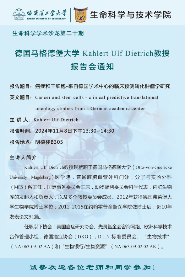 【生命科学学术沙龙第二十期】德国马格德堡大学 Kahlert Ulf Dietrich教授报告会通知